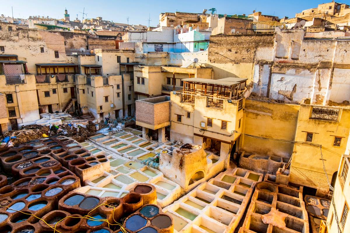 Visite de la Médersa Bou Inania, puis découverte des célèbres ateliers artisanaux : mosaïques, bronzes, tapis, teintureries, etc. Passage par les célèbres tanneries de Fès, où le cuir est encore travaillé selon des méthodes traditionnelles ancestrales à base de teintures naturelles.