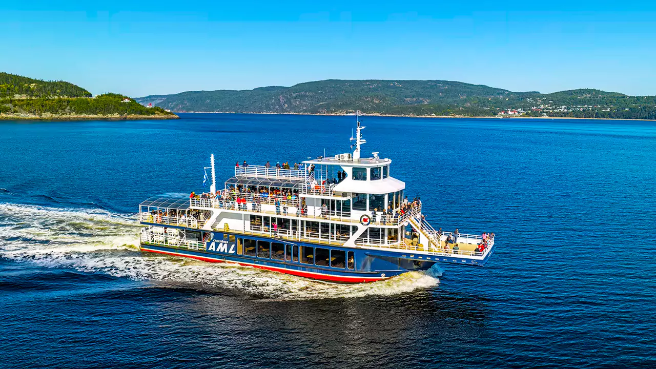 Le matin, départ de Montréal en direction de Charlevoix. Le long du trajet, vous longerez le fleuve Saint-Laurent et pourrez admirer les magnifiques paysages riverains. À votre arrivée, embarquez pour une croisière sur le fleuve Saint-Laurent, à la Baie Sainte-Catherine, où vous aurez l'occasion d'observer les majestueuses baleines, notamment les impressionnantes baleines bleues pesant entre 8 et 130 tonnes.